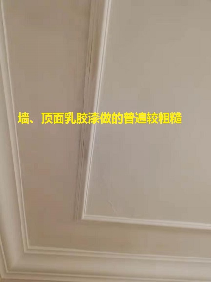 墙顶面乳胶漆都比较粗糙,流坠、疙瘩、色差较多,基层腻子坑凹不平,高低接荐都未打磨