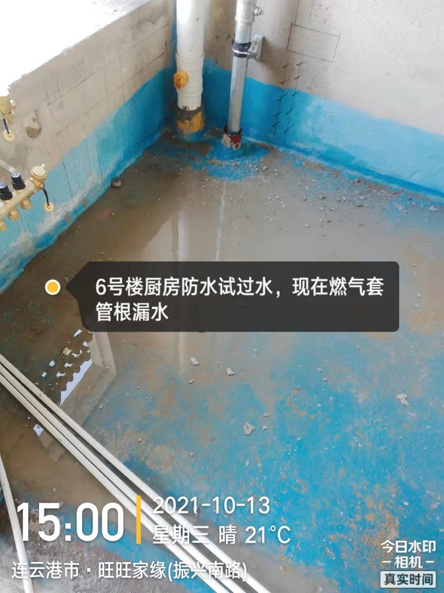 地暖分水器在厨房,在铺装地暖前厨房地面做防水,闭水试验查验烟道、排水管、燃气套管根部是否渗漏