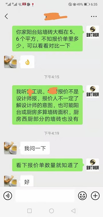 在贴砖巡检中又发现了凝点!看到阳台墙面砖只是洗衣伴侣处三面墙贴砖,其它墙面做休闲阳台处理,我怀疑阳台贴砖报价面积与实际不符,通知业主看下报价单墙面砖数量,不看不知道一看吓一跳,实际6个多平米,报价单数量按两个通间大阳台满算,三十几平方,业主事先与设计师沟通时也说过,只贴局部,现在多出来三十平,还有窗户倒角,如果不是监理留心追问,这多算的部分装修公司会良心发现减掉吗?真是处处是坑!